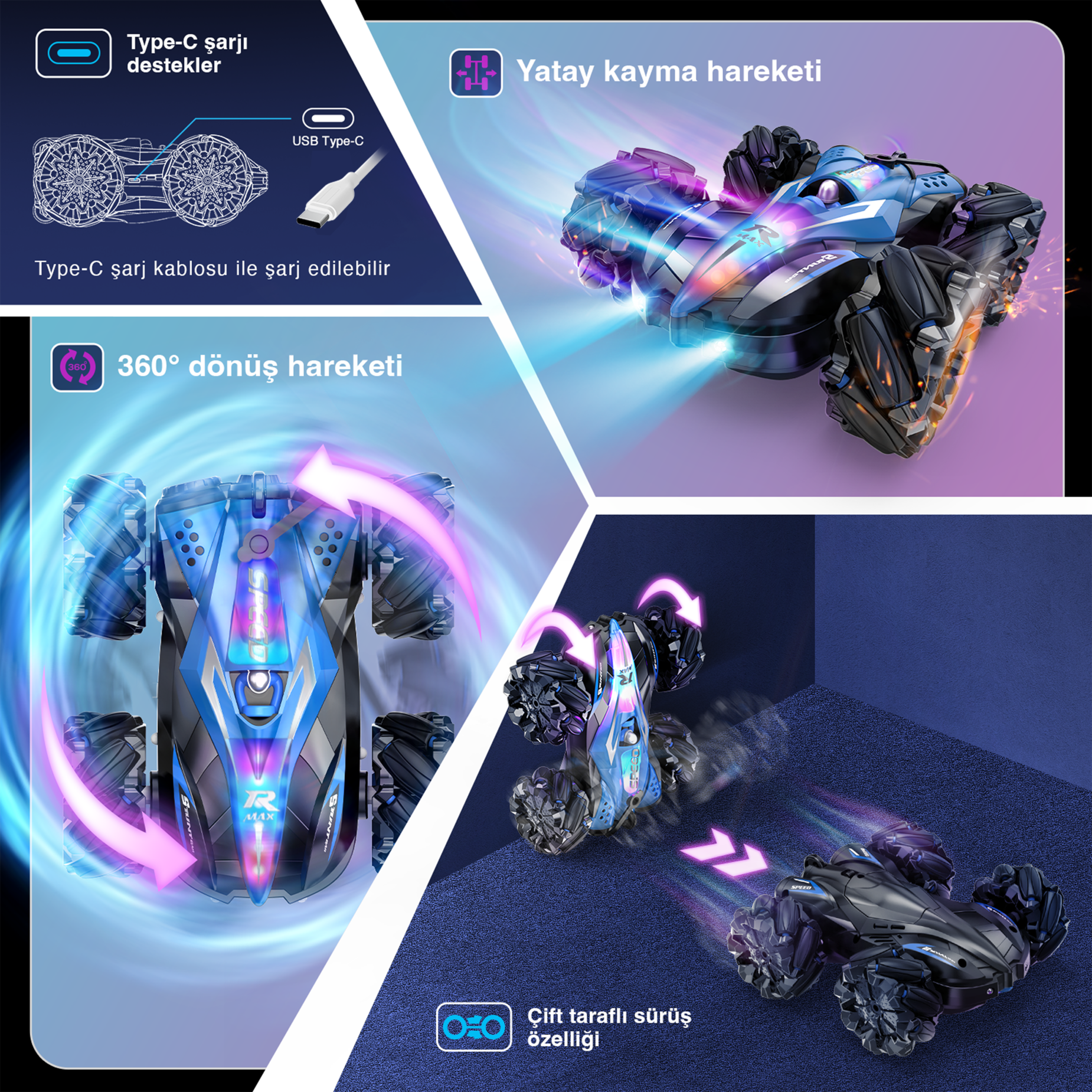 cv-D901-2 Akrobatik RC araba, çocuklar ve yetişkin kullanıcılar için eğlenceli ve kontrollü bir sürüş deneyimi sunmak üzere tasarlanmıştır. Dengeli yapısı ve çok kanallı kontrol sistemi sayesinde farklı yönlendirme hareketlerine hızlı tepki verir. Dayanıklı gövdesi, uzun süreli kullanımlarda güvenilir performans sağlarken hem kapalı hem de açık alanlarda keyifli bir oyun deneyimi sunar. Kullanıma hazır yapısı ile hediye ve günlük kullanım için ideal bir tercihtir.
