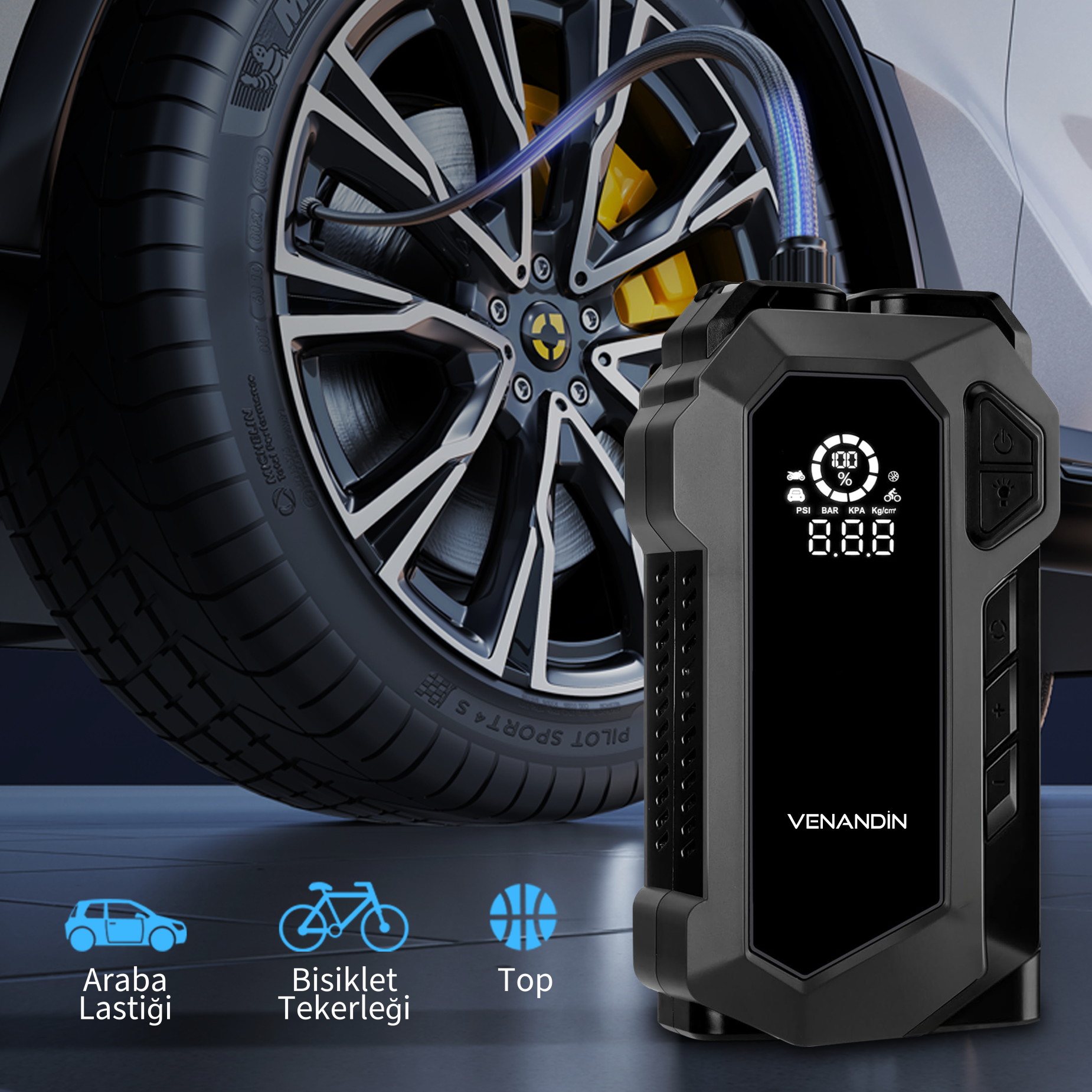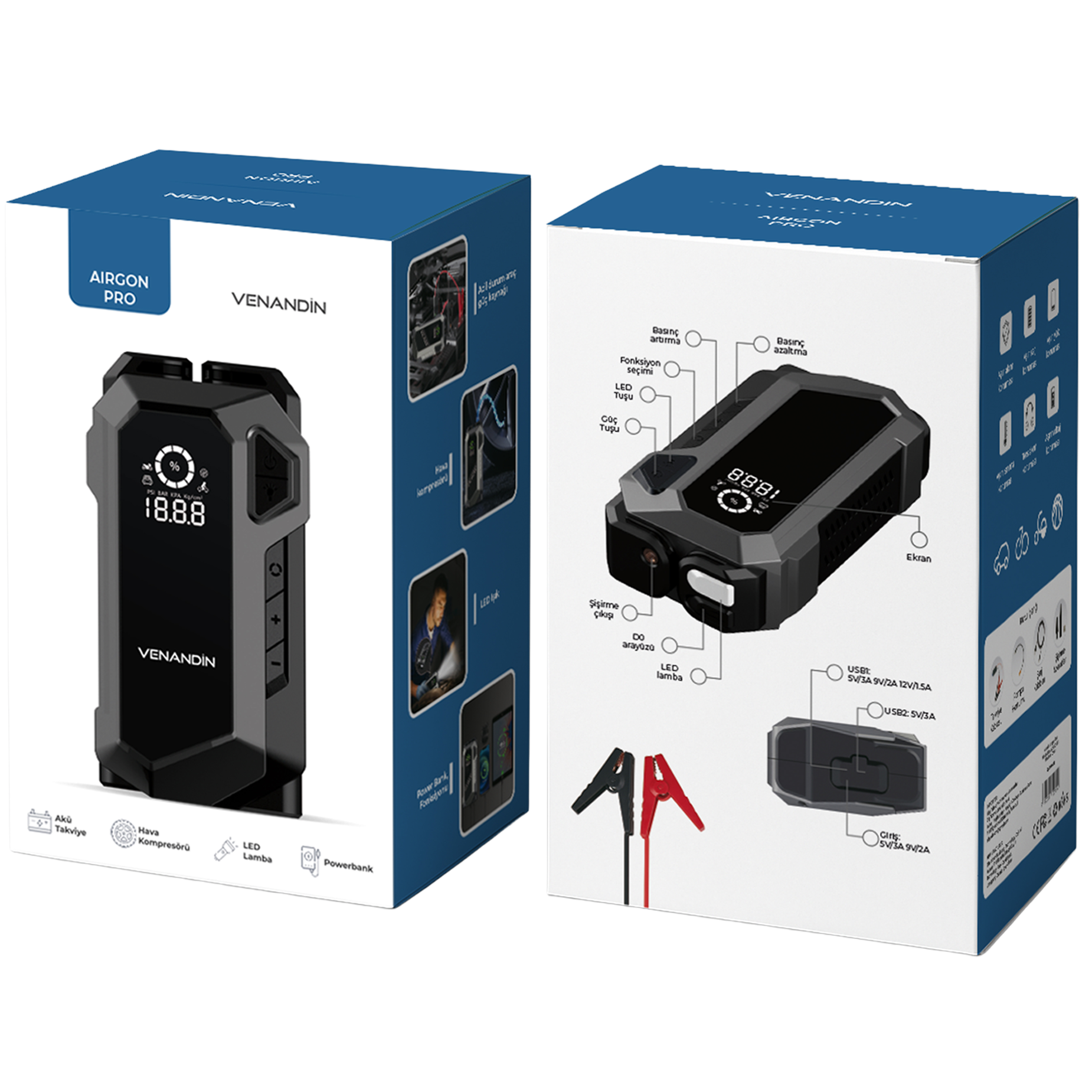 VENANDİN ACARG-002 AirgonPro KABLOSUZ AKÜ TAKVİYE&KOMPRESÖR, sürücüler için yol güvenliğini ve konforu artırmak amacıyla tasarlanmış çok yönlü bir acil durum çözümüdür. Tek bir cihaz içerisinde akü takviye ünitesi, hava kompresörü, taşınabilir güç kaynağı ve güçlü LED aydınlatmayı bir araya getirerek araçla ilgili beklenmedik durumlarda maksimum pratiklik sağlar.